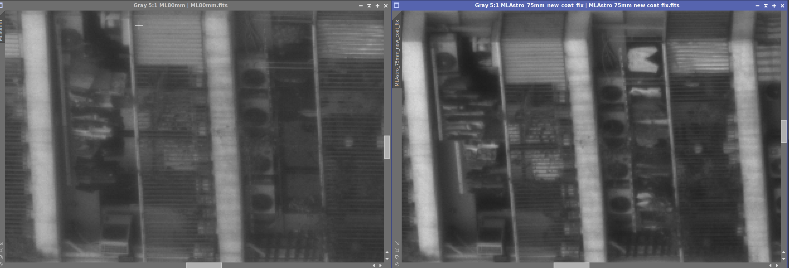 Edge sharpness on MLAstro 72mm F/3.4 and a high quality 25.4mm dia, 80mm FL doublet on IMX178. The MLAstro compound lens offers significantly better sharpness and focus at the very edge of the frame.
